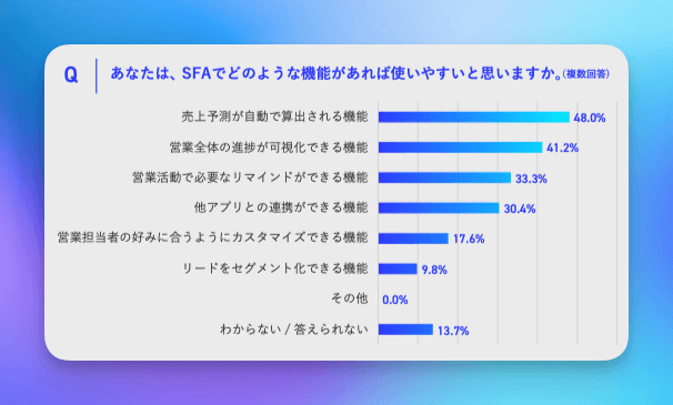 実は、「売上予測が自動で算出される機能」や「営業全体の進ḿが可視化できる機能」は多くの SFA が保有 しています。一方で、営業担当者によりこれらの機能が求められていることから、すでに機能があること が認知されていないといったケースも多いのかもしれません。その課題を払拭するために、直感的なわか りやすさや必要な機能を絞るなどの対策をすると良いでしょう。