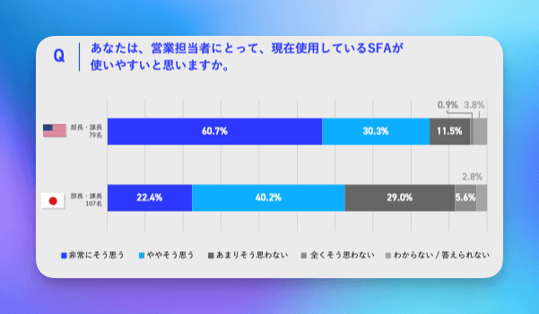 管理側(部長・課長)に、営業担当者が現在使用している SFA の「使いやすさ」を聞いたところ、 海外は 60.7%、日本は 22.4% で 38.3 ポイントの差が出ています。