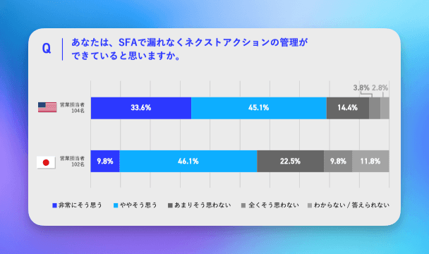 SFA で漏れなくネクストアクションの管理ができている営業担当者も、海外 33.6%、日本 9.8% で、 23.8 ポイントの差が開いていることから、海外の方が日本よりも SFA での管理が徹底されている実態が明らかになりました。