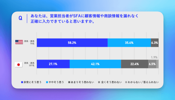 「営業担当者が SFA に顧客情報や商談情報を漏れなく正確に入力できている」と感じている海外の部長・課長は 58.2%、日本の部長・課長は 27.1% となり、31.1 ポイントもの差が出ていること が明らかとなりました。また、現場よりも管理側の方が差が大きく開いています。