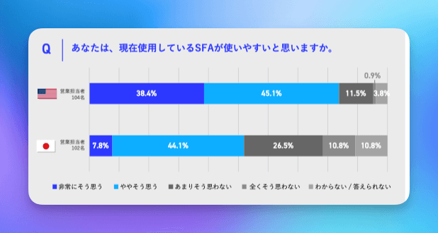 現場側(営業担当者)に、現在使用している SFA の「使いやすさ」を聞いたところ、海外では 38.4%、日本では 7.8% が使いやすいと回答し、30.6% もの差が出ていることが明らかとなりまし た。