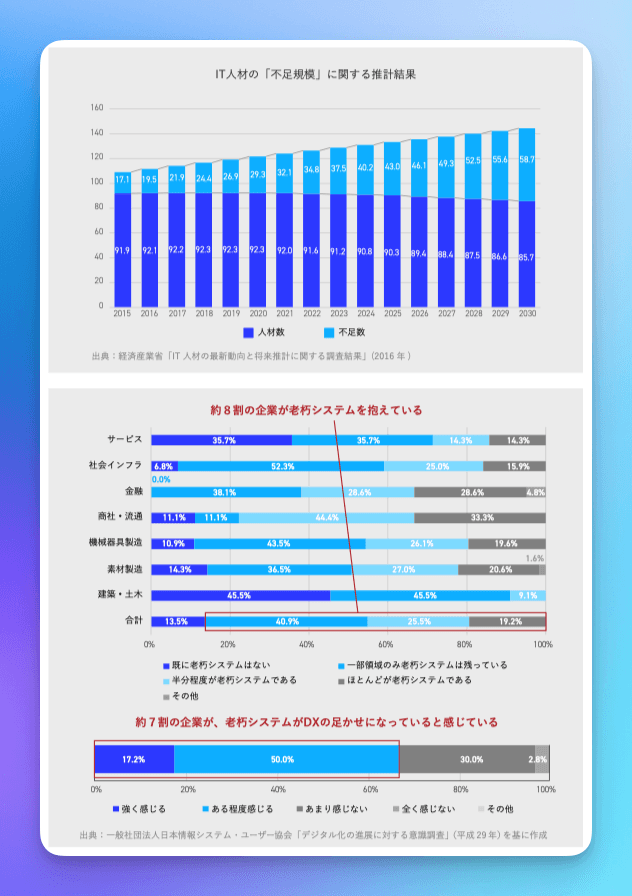 そのため、IT 人材の不足への対応と、レガシーシステムの新システムへの連携が求めら れています。