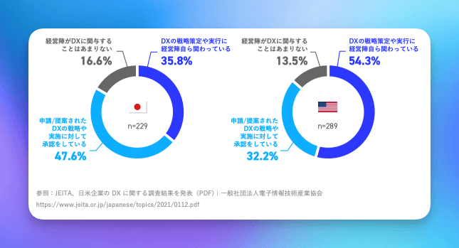 「顧客情報や商談情報の漏れのない記載」「ネクストアクションの管理」など、記入と管理の観点から海外 の方が SFA の定着が進んでいる実態が明らかとなっています。 また、JEITA が行った調査によると、経営陣 DX に対する姿勢として米国が高いことからも、現場層への使 いやすいツールの浸透が DX に貢献していると言えるのではないでしょうか。